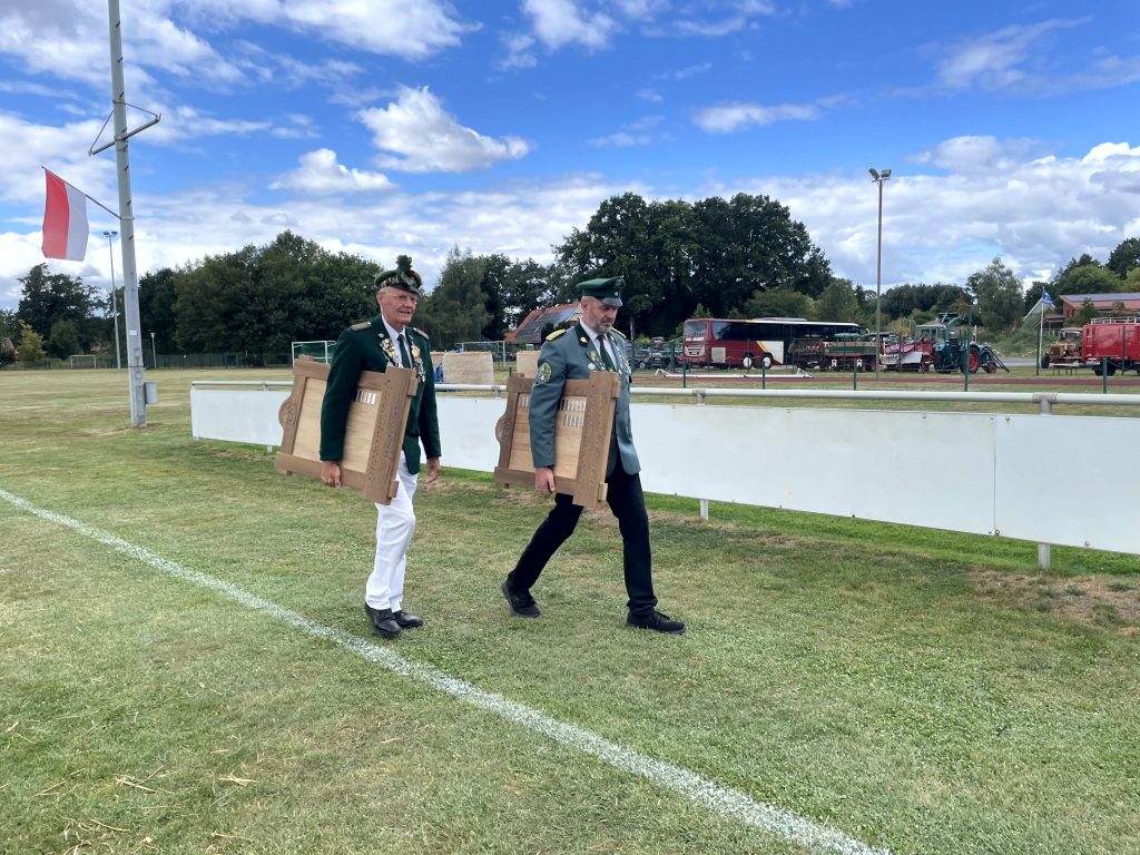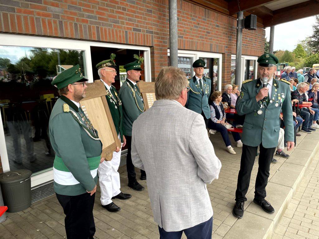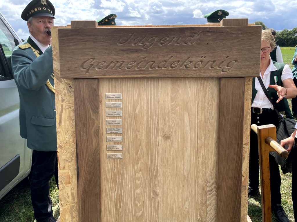 Ein besonderes Highlight: Präsident Klaus Morthorst hatte als Geschenk aller Präsidenten im Kirchspiel zwei Holztafeln gefertigt. Auf ihnen sind sämtliche vergangenen Gemeindemajestäten der Erwachsenen und Jugendlichen abgebildet. Vor 25 Jahren war die Idee eines erwachsenen Gemeindemajestäten geboren.